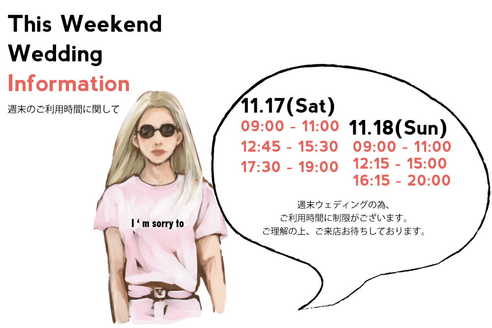 11.17(Sat)、11.18(Sun) はウェディングの為、