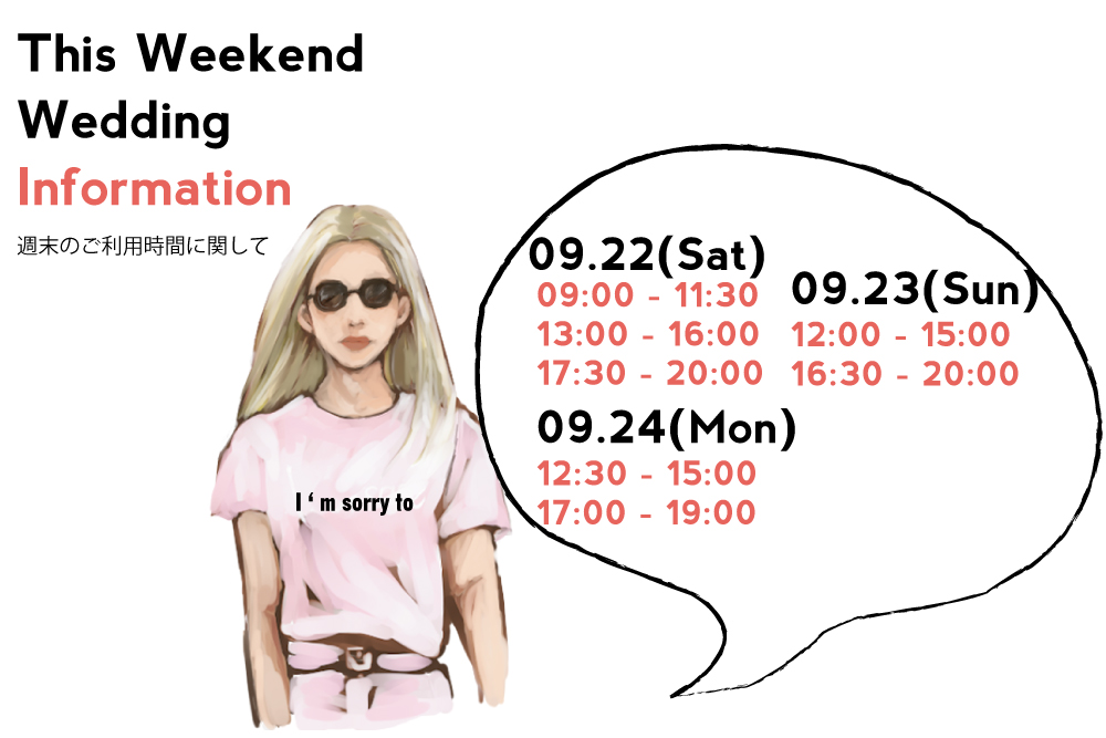 09.22(Sat) , 09.23(Sun) , 09.24(Mon)はウェディングの為、