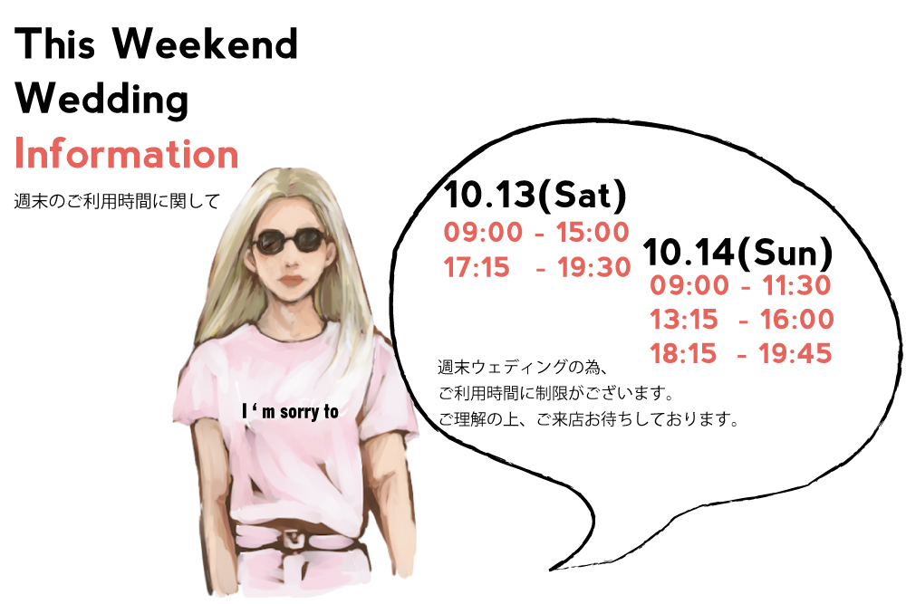 10.13(Sat) , 10.14(Sun) はウェディングの為、